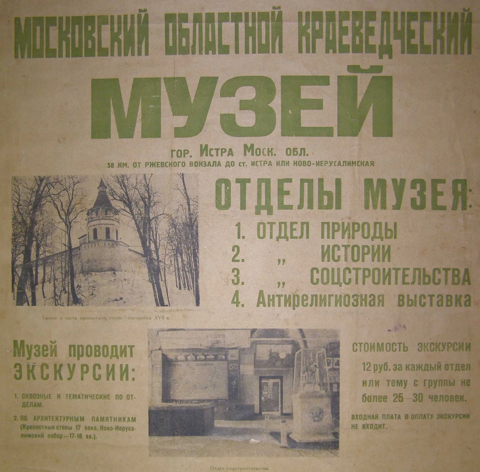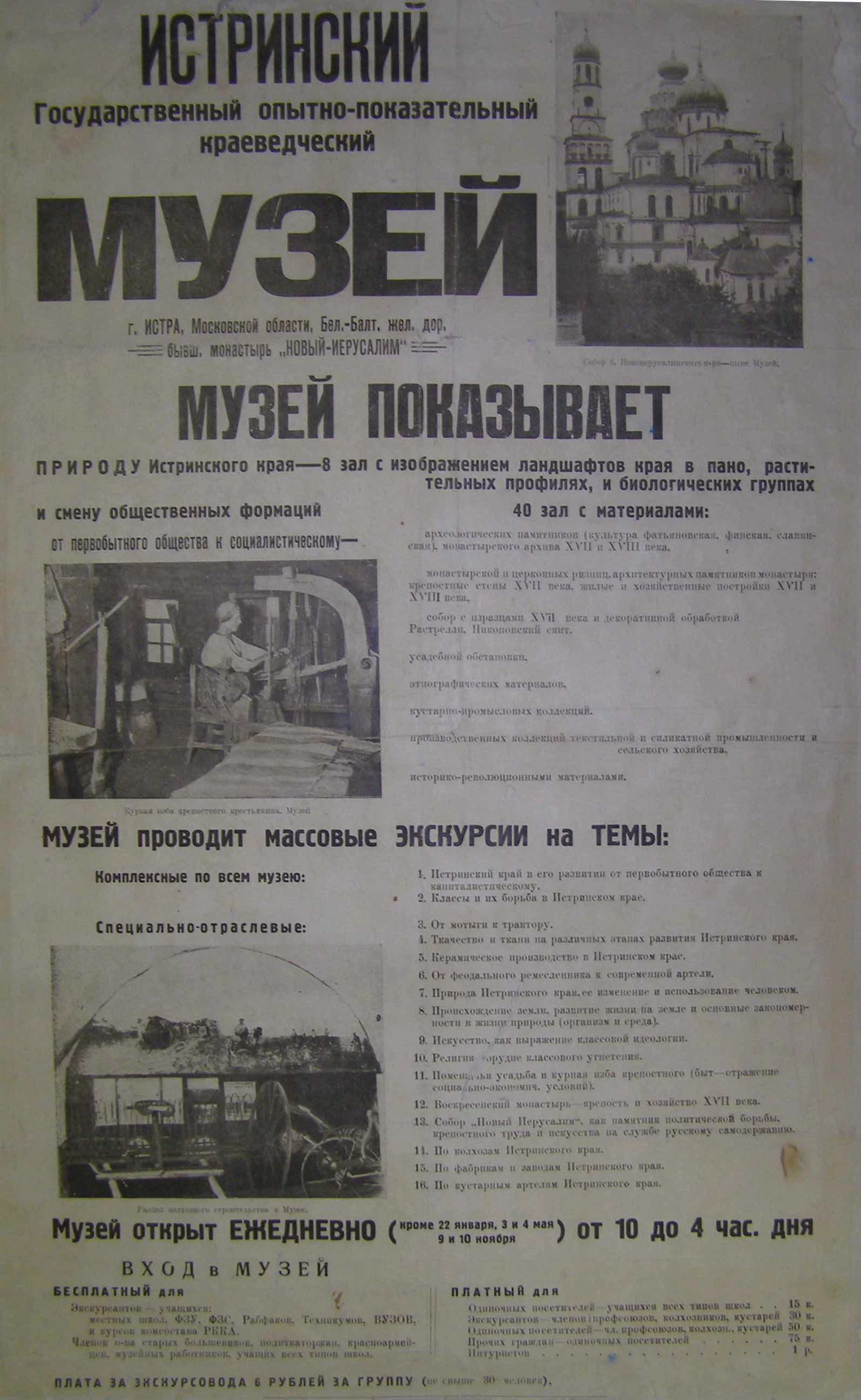 Первая экспозиция музея была открыта в Трапезных палатах Ново-Иерусалимского монастыря в 1925 году. В дальнейшем она расширялась и совершенствовалась. В 1935 году музей в Истре получил статус Московского областного краеведческого музея и под таким названием просуществовал до 1991 года. Он обладал богатейшими историческими и художественными коллекциями, обширной экспозицией (42 зала) и считался показательным для музеев своего региона.