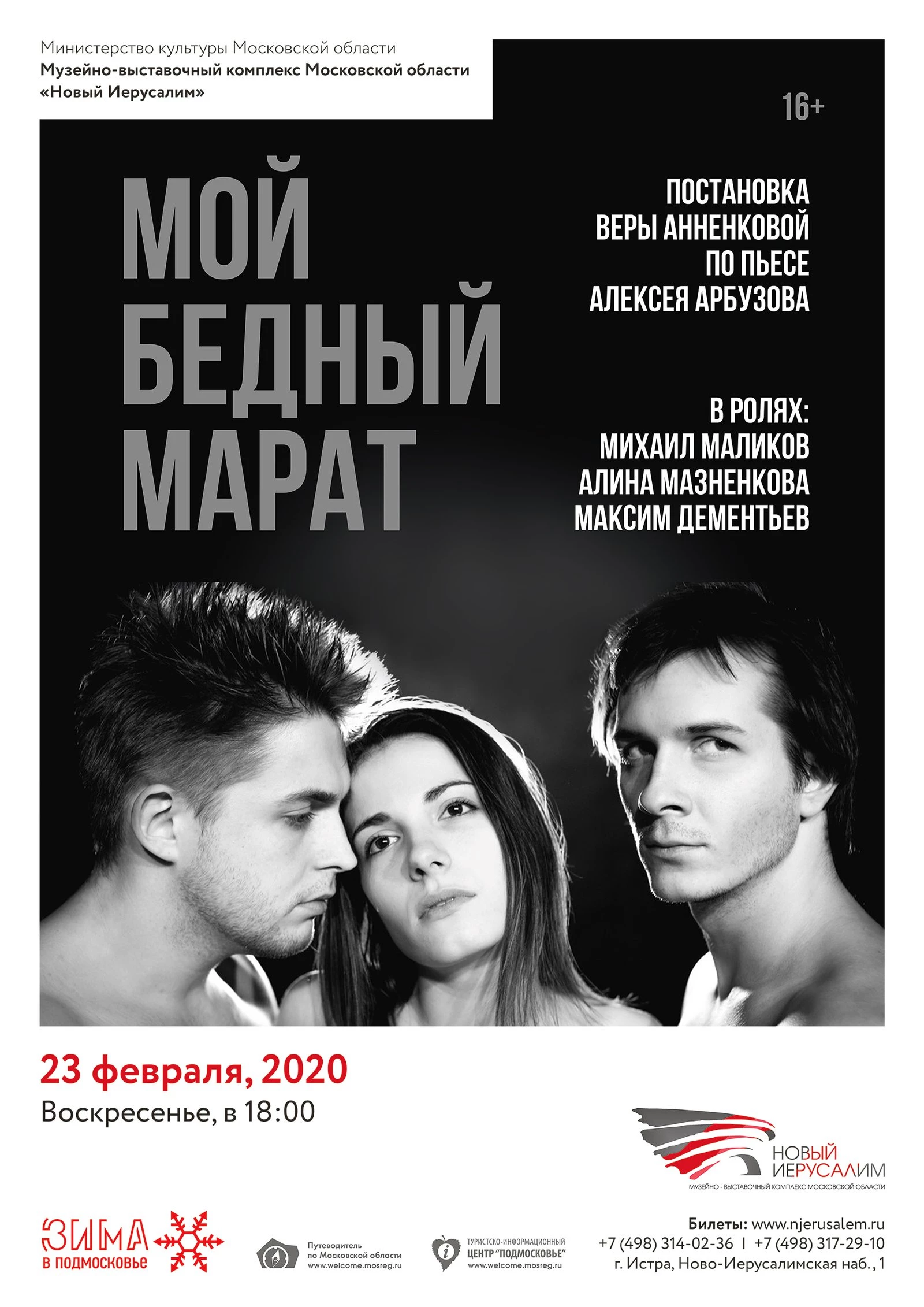 23 февраля в 18.00 на сцене музейно-выставочного комплекса «Новый Иерусалим» постановка Веры Анненковой по пьесе Алексея Арбузова «Мой бедный Марат» (16+).