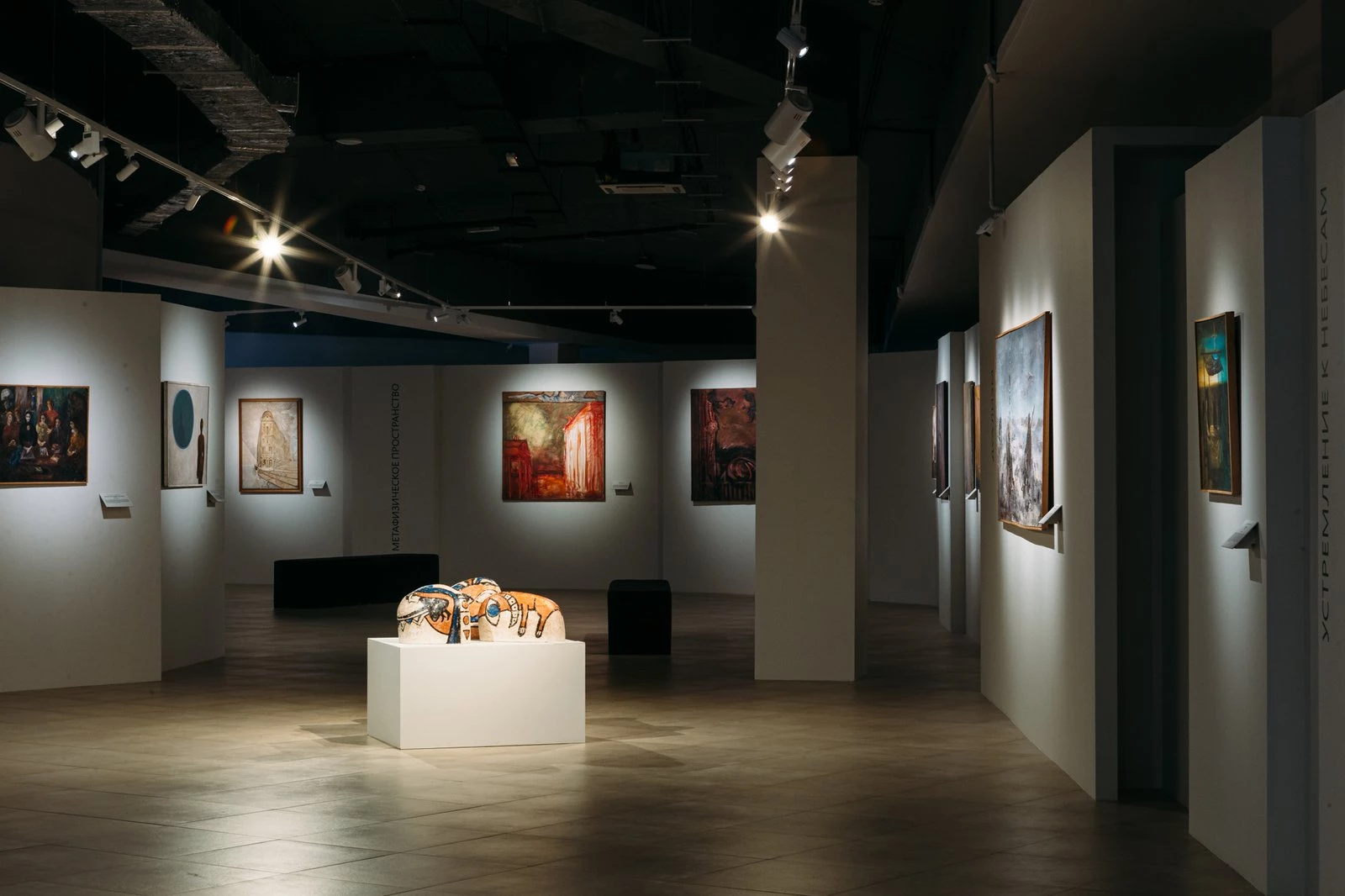 Архитектура выставочного пространства и камерность экспозиционных залов создали особую медитативную атмосферу, позволяющую совершить путешествие по лабиринтам пространства и времени и включиться в игру узнавания способов создания художниками своих картин.