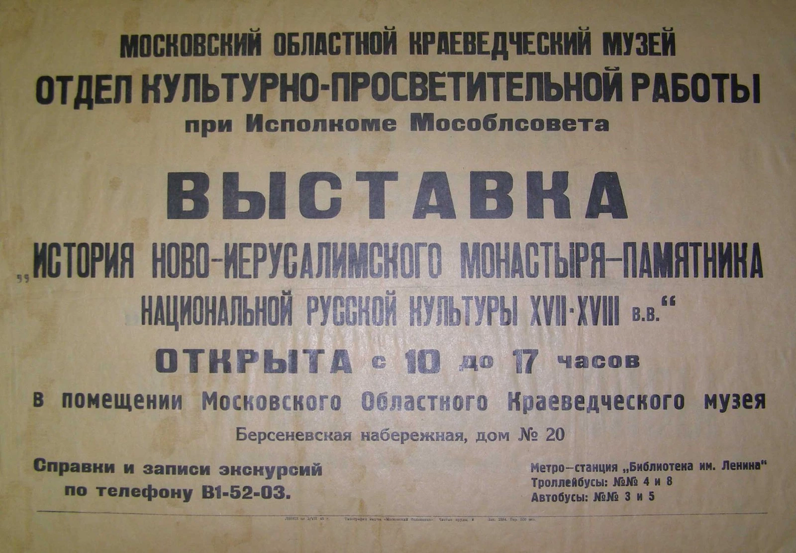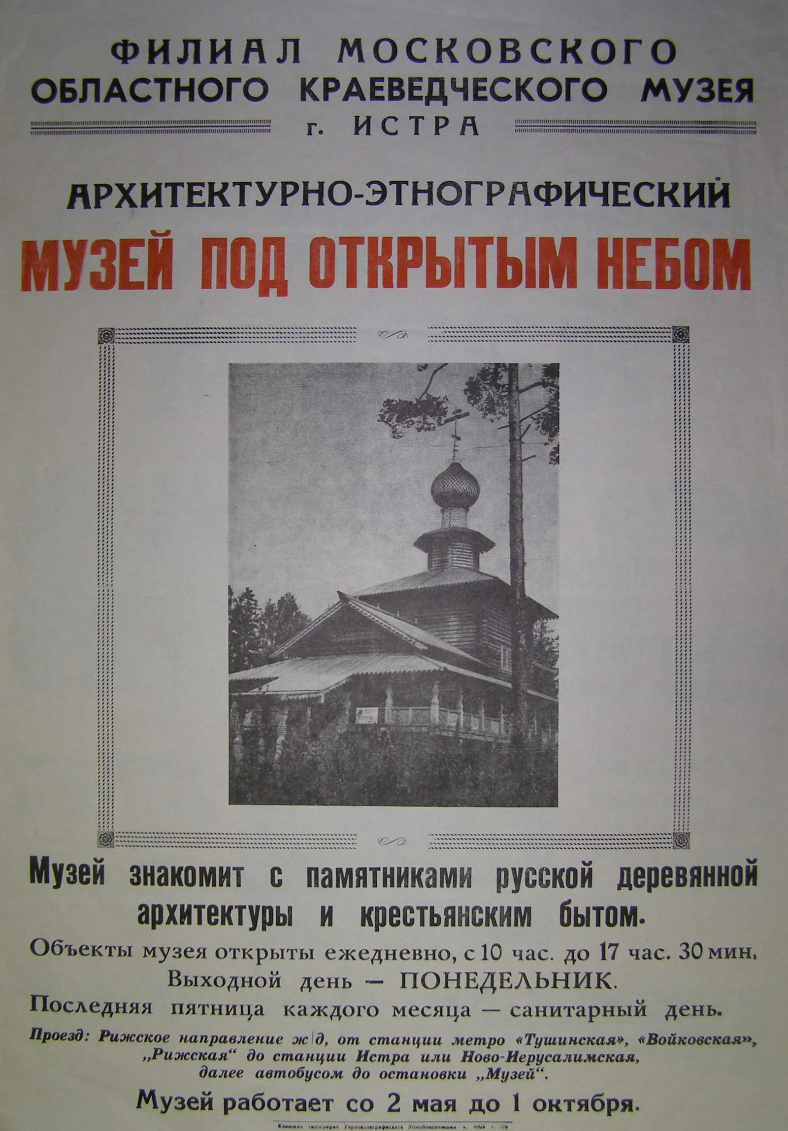 Первая экспозиция музея была открыта в Трапезных палатах Ново-Иерусалимского монастыря в 1925 году. В дальнейшем она расширялась и совершенствовалась. В 1935 году музей в Истре получил статус Московского областного краеведческого музея и под таким названием просуществовал до 1991 года. Он обладал богатейшими историческими и художественными коллекциями, обширной экспозицией (42 зала) и считался показательным для музеев своего региона.