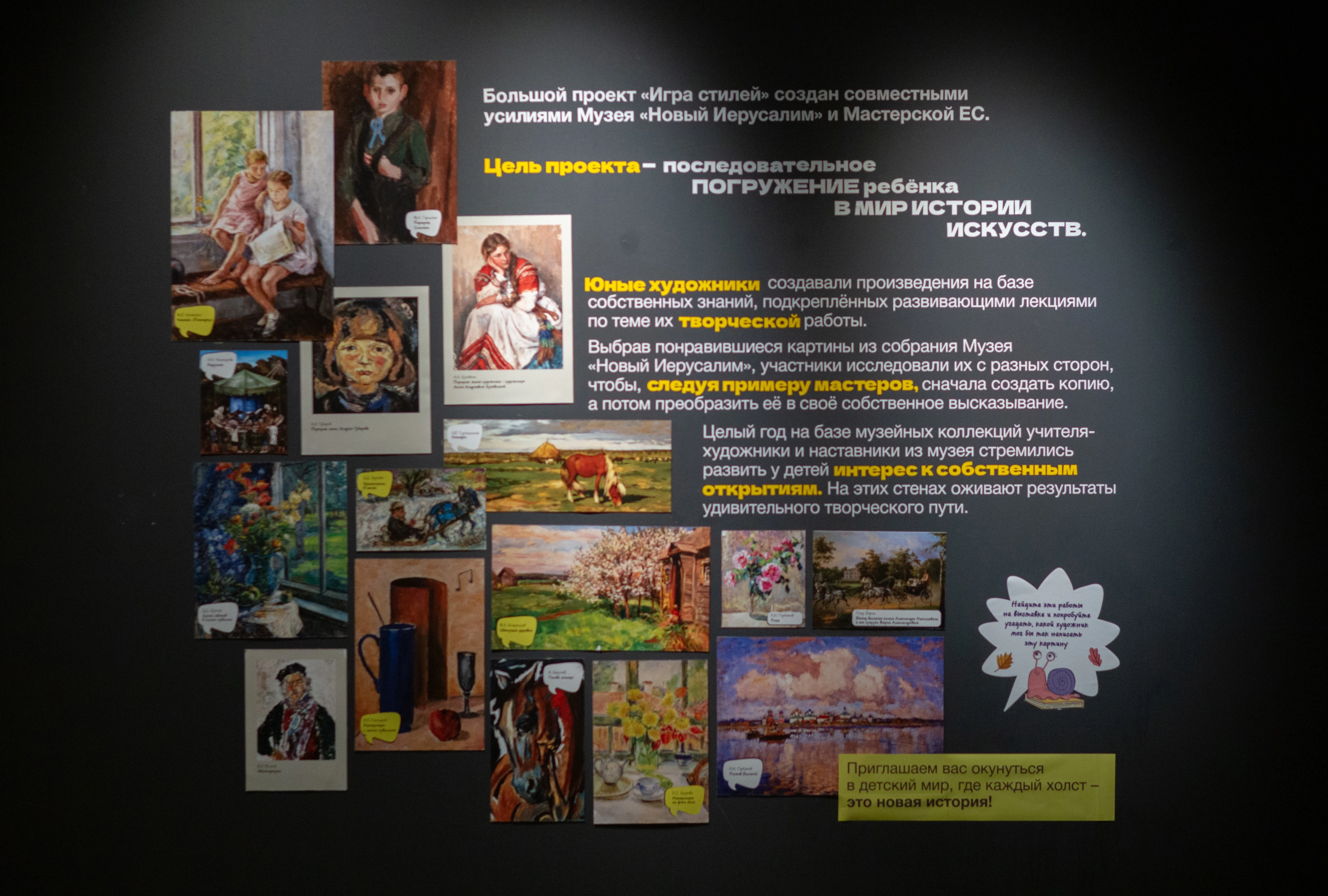 Творческая коллаборация между музеем и мастерской Екатерины Савельевой стала доброй музейной традицией. Впервые детский взгляд на искусство прозвучал в «Новом Иерусалиме» в 2023 году. В прошлом сезоне ребята творили, вдохновляясь работами мастеров в экспозиции выставки ««Формула Руси 17/20. Образ допетровской России в искусстве Серебряного века», итогом стала выставка работ юных художников «В некотором царстве, в музейном государстве». Формат полномасштабной выставки в этом году подчёркивает значимость детского творчества в стенах музея.